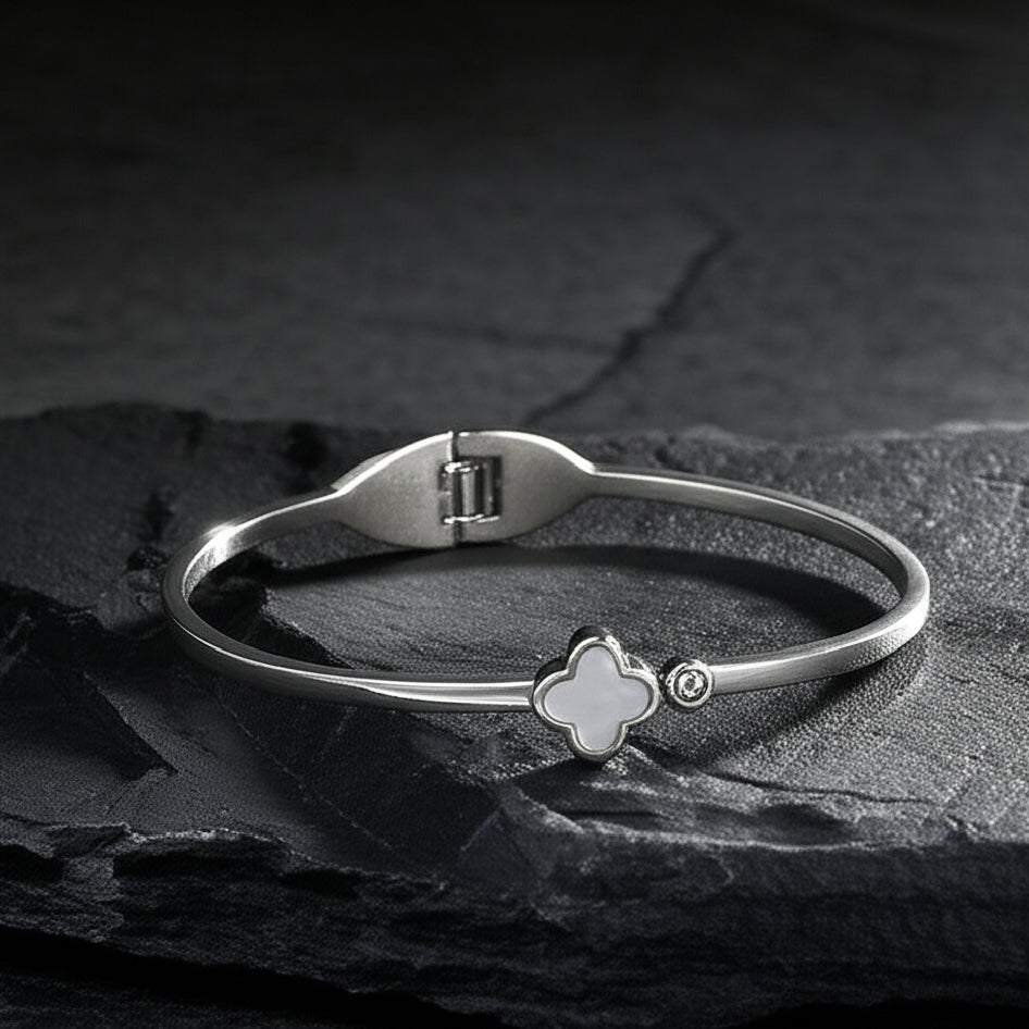 Add a touch of refined elegance to any outfit with our Dainty Clover Bracelet . This exquisite artificial bracelet is crafted with a sleek, polished silver-toned band, featuring a delicate clover charm with a pristine white mother-of-pearl inlay. A single, sparkling cubic zirconia stone sits adjacent to the clover, adding a subtle hint of glamour and catching the light with every movement.
