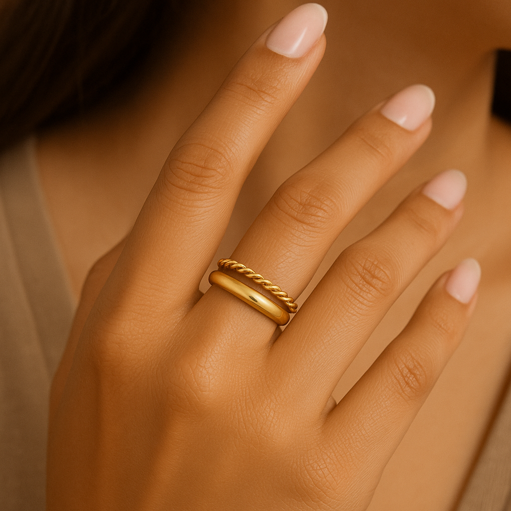 The Eloria Twin Rings bring timeless elegance to your collection with a modern twist. This duo features a slim polished band paired with a delicate rope-style ring—crafted from premium artificial materials to give you the look and shine of fine jewelry without the luxury price tag. Designed for stacking or wearing solo, they’re versatile, stylish, and perfect for elevating everyday outfits or gifting with love.