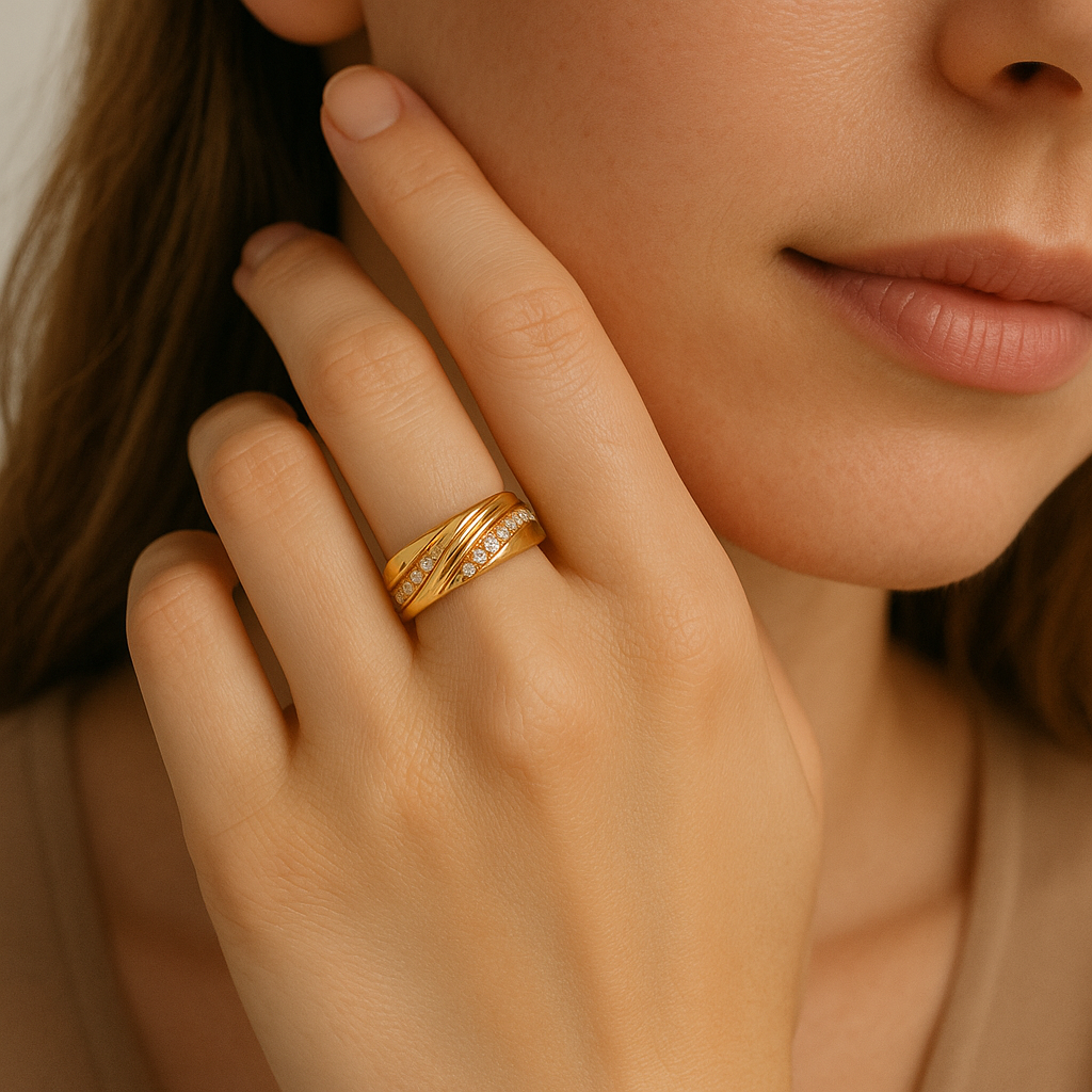 Elevate your style with our Velora Ring, crafted with a bold yet elegant design. Featuring dual pavé rows of sparkling simulated stones set diagonally across the band, the ring is accented by sweeping grooves that add depth and sophistication.