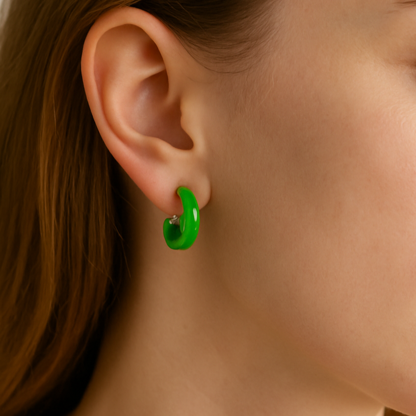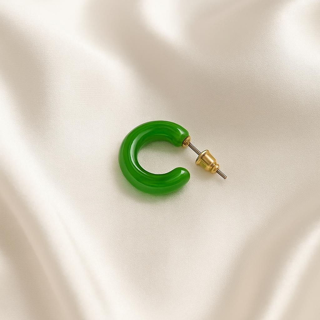 Add a pop of bold elegance with our VerdeLoop Plastic Hoops. Crafted from durable lightweight plastic in a glossy jade-green finish, these hoops offer the perfect balance of style and comfort for everyday wear. stud detail enhances their premium look, making them a chic yet affordable accessory.